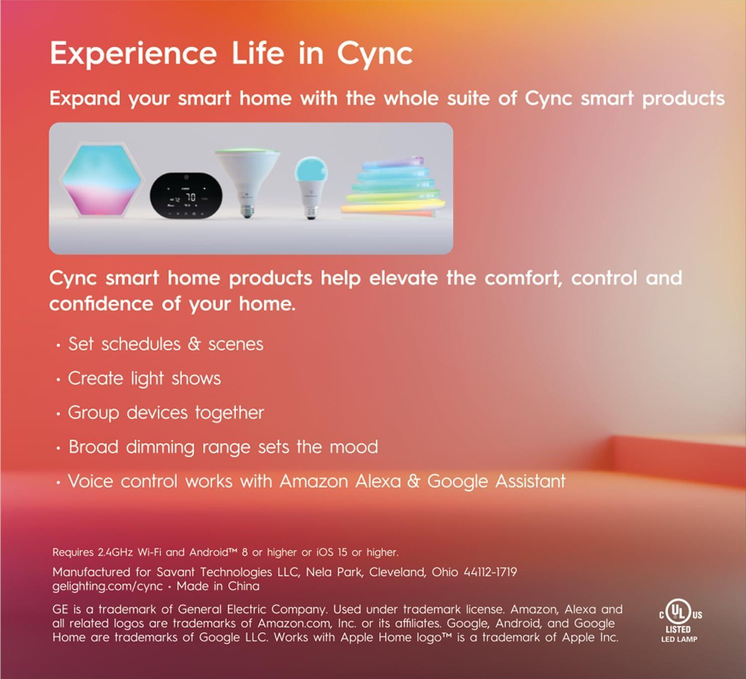 The GE Cync Smart Bulb Color Changing Lights make it easy to enhance your room light or to celebrate the holidays. Use millions of colors to decorate for each holiday, create the perfect party vibe, and support your team on game day with each Cync light bulb. Find the right aesthetic décor for your gaming room, improve your LED work light, or use our LED floodlight bulbs as bedroom lights. These indoor light bulbs feature a tunable white spectrum, allowing you to get the perfect hue that highlights your home's landscaping and architecture. Get additional confidence by scheduling your CYNC lights to turn on so that you improve home security and never come home to a dark house. With voice control and the ability to control your lights away from home, you'll get the added convenience of controlling each WiFi bulb while you’re away on vacation or when your hands are full. Our colored light bulbs pair easily with Amazon Alexa and Google Assistant smart home devices (sold separately).