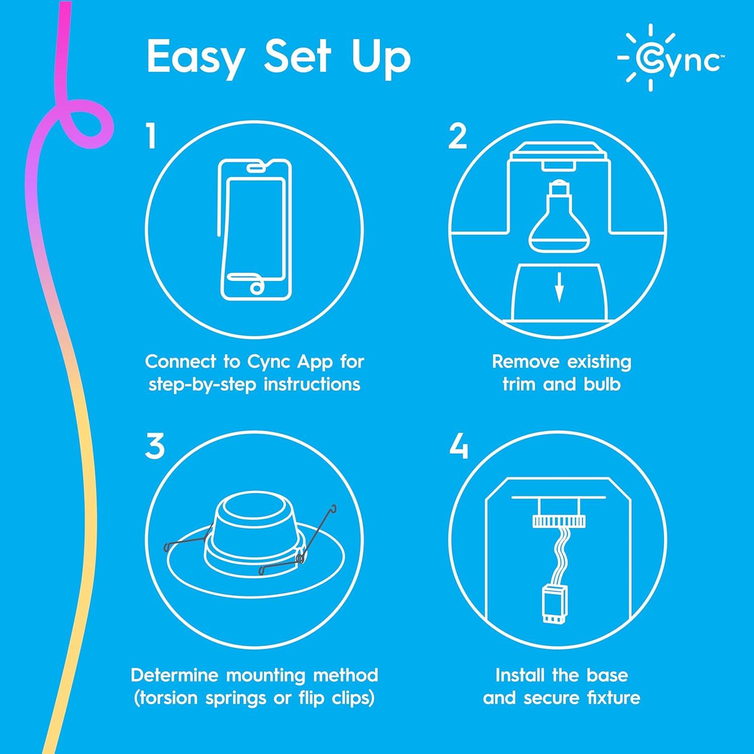 Simple Setup: These LED recessed lights work right out of the box with no recessed can housing needed; Control your downlights at or away from home with the Cync app, powered by Savant; 2.4GHz Wi-Fi connection is required for control of smart devices
