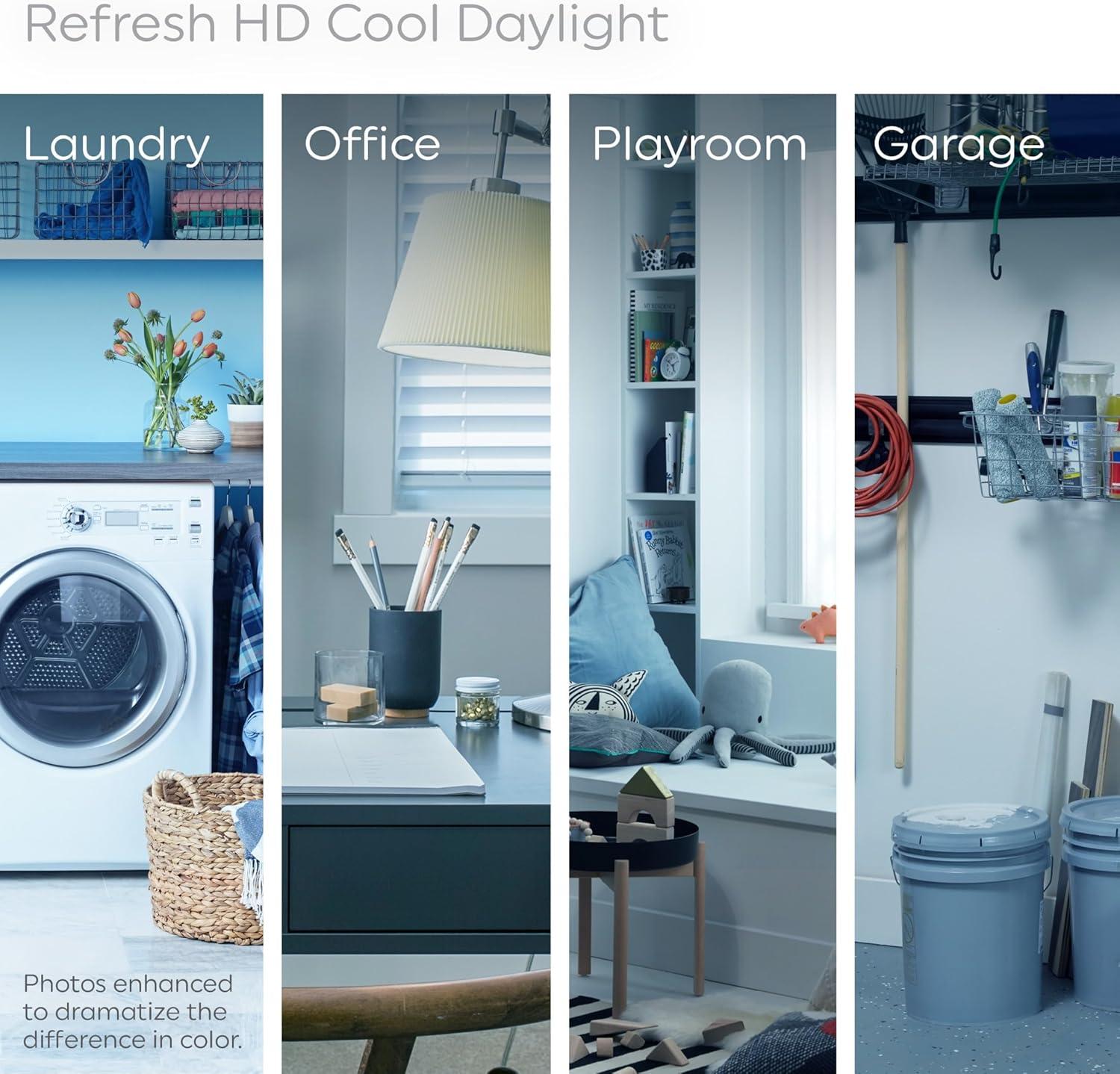 Our High Definition bulbs are an improved, energy-saving LED that enhance the appearance of colors. Experience the difference with bolder colors and enhanced contrast vs. Our standard LED bulbs. Refresh™ HD light offers a cool, invigorating light perfect for energizing moments and active spaces. Use refresh™ HD light in playrooms, home offices and laundry rooms.