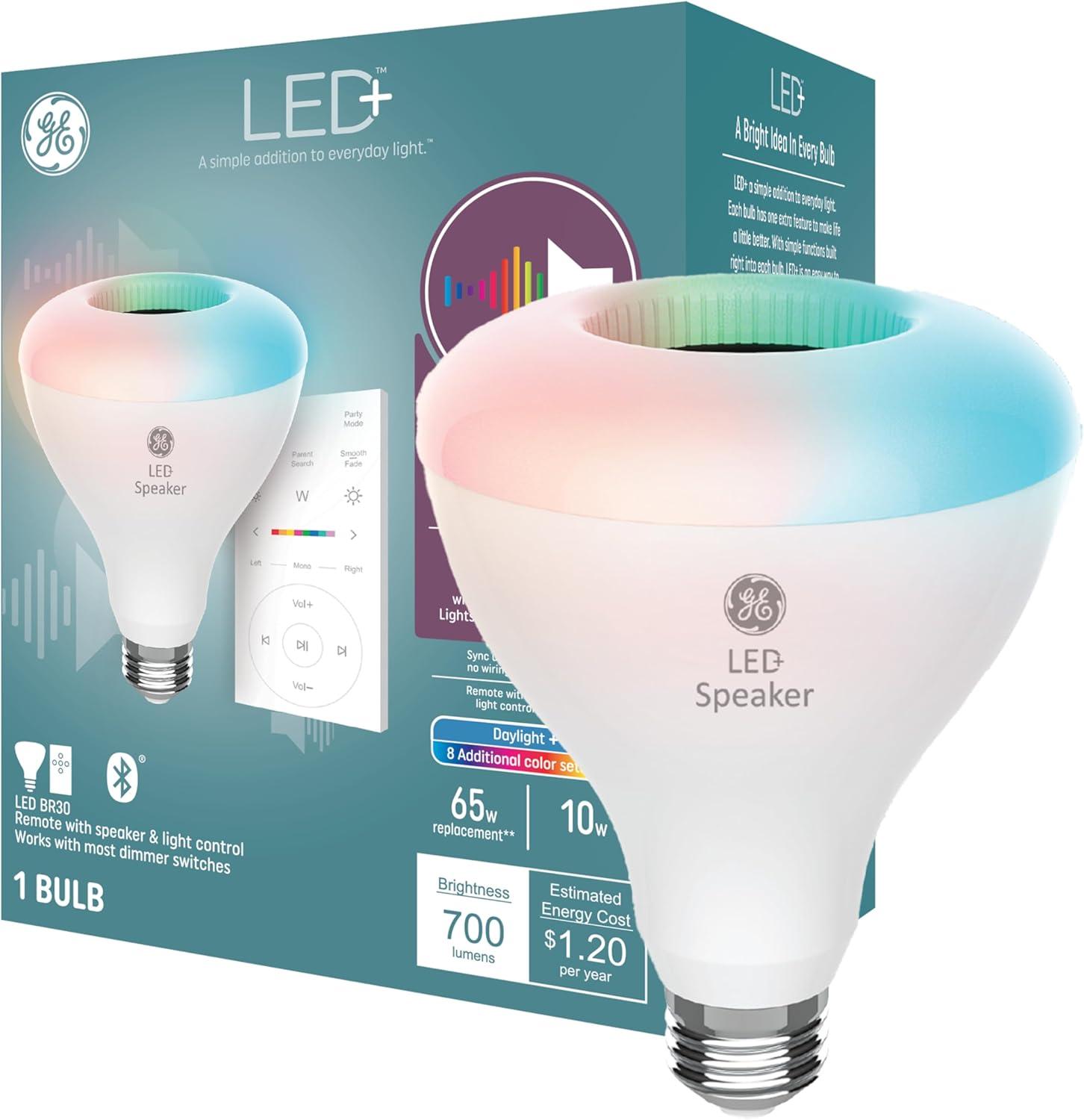 Introducing the GE LED+ Bluetooth Speaker LED Light Bulb. Elevate your ambiance with multiple color options and immersive sound, all effortlessly controlled via a convenient wireless remote – no app, hub, or Wi-Fi required! With a spectrum of colors at your fingertips, our LED color changing light bulb allows you to tailor your environment to suit any mood or occasion. Whether it-s a cozy night in, a lively party, or a serene moment of relaxation, set the perfect atmosphere with just a tap. Our Bluetooth Speaker Light Bulb goes beyond lighting to deliver high-quality audio without wires. With easy setup, simply screw in the indoor light bulb into a lamp or light fixture that fits an E26 medium base bulb, turn on the light then connect the bulb on your smart phone or tablet via Bluetooth technology. For surround sound, connect up to 10 LED+ speaker bulbs within 25ft of the parent bulb then turn on the lights to automatically sync to the parent bulb. Experience the freedom of wireless control as you effortlessly manage both light and sound with the included remote. Adjust brightness, switch colors, skip tracks, or fine-tune volume – all from the comfort of your couch. This energy-efficient light bulb will save on energy costs with long-lasting LED technology using only 9 watts compared to a traditional 60-watt light bulb. It-s everything you love about LED plus a simple wireless speaker solution. WARNING: This product contains a lithium button/coin cell battery. Keep coin cell batteries out of reach of children.