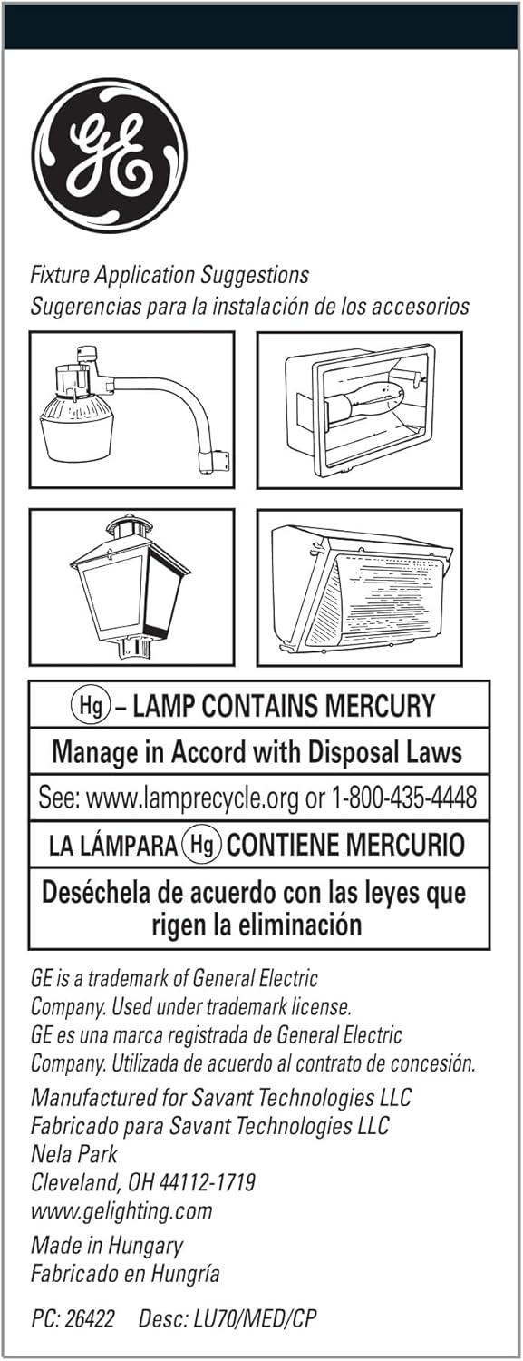 GE 26422 70-Watt LUCALOX70 HID High Pressure Sodium MED BASE. Bulb Diameter (DIA) [Nom]: 2.125 in, Bulb Finish: Clear, Bulb Material: Hard glass, Burn Position: Universal burning position, Color Rendering Index (CRI): 22, Color Temperature: 1,900 K, Effective Arc Length: 1.060000 in, Hot Restart Time to 90 percent [Max]: 0.670 min, Initial Lumens [Nom]: 6,400.00, Lamp Enclosure Type (LET): Open or enclosed fixtures, Light Center Length (LCL): 3.430 in, Maximum Overall Length (MOL): 5.4300 in, Mean Lumens [Nom]: 5450, Mercury Content: 13.700 mg, Nominal Initial Lumens per Watt: 91, Nominal Length: 5.430 in, Open Circuit Voltage (RMS lag ballast) [Min]: 110 V, Picograms of Mercury: 104.7 pg, Product Technology: High Intensity Discharge, Rated Life [Min]: 24,000 h, Wattage: 70GE HID (High Intensity Discharge) lamps provide high efficacy and low operating cost. The HID is generally the most efficient light source. Better efficiency almost always means lower operating cost. They also have a long life. Most HID lamps have life ratings that are better than incandescent lamps and similar to fluorescent lamps. An HID lamp produces high light output from a relatively compact source. Like incandescent, it is a “point” light source, which allows for good optical control. Light bulb efficiency is measured in lumens per watt (LPW). Rated life for HID lamp life depends on the number of hours per start. The combination of high efficiency and long life makes HID an ideal light source for many commercial and industrial applications.