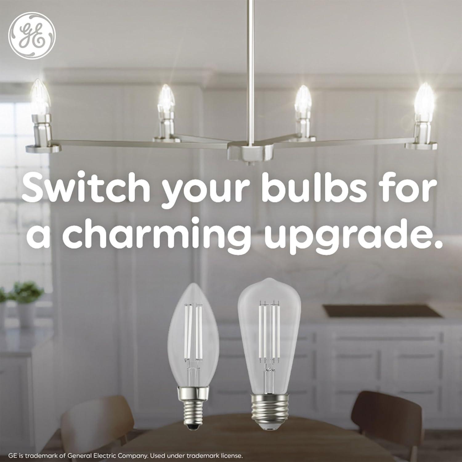 Elevate your décor with brilliance using GE Pearl Filament HD LED Soft White Light Bulbs. Designed to seamlessly blend into the background with classic charm of filament light bulbs with the efficiency and longevity of LED technology, Pearl Filament LED bulbs provide a timeless aesthetic of sophistication. Compared to standard yellow LED filaments that disrupt a fixture’s aesthetic, the subtle filament and clear glass beautifully accentuate decorative fixtures offering room light with a soft white cozy glow. Whether you’re looking to brighten your bedroom lights and work lights or add ambiance to a dining area – together with high-definition, comfortable lights, Pearl Filament lights elevate the charm of your lights when on or off. With a lifespan of up to 15,000 hours, our bulbs are built to last, reducing the hassle and cost of frequent replacements. These are also dimmable bulbs, allowing you to dim and customize the brightness to suit any occasion or mood. Our clear light bulbs are available in a variety of shapes and sizes to fit standard light fixtures with an E26 medium base or an E12 small candelabra base. Upgrade your room décor today with the perfect balance of elegant charm and efficiency with GE Pearl Filament HD LED Light Bulbs.
