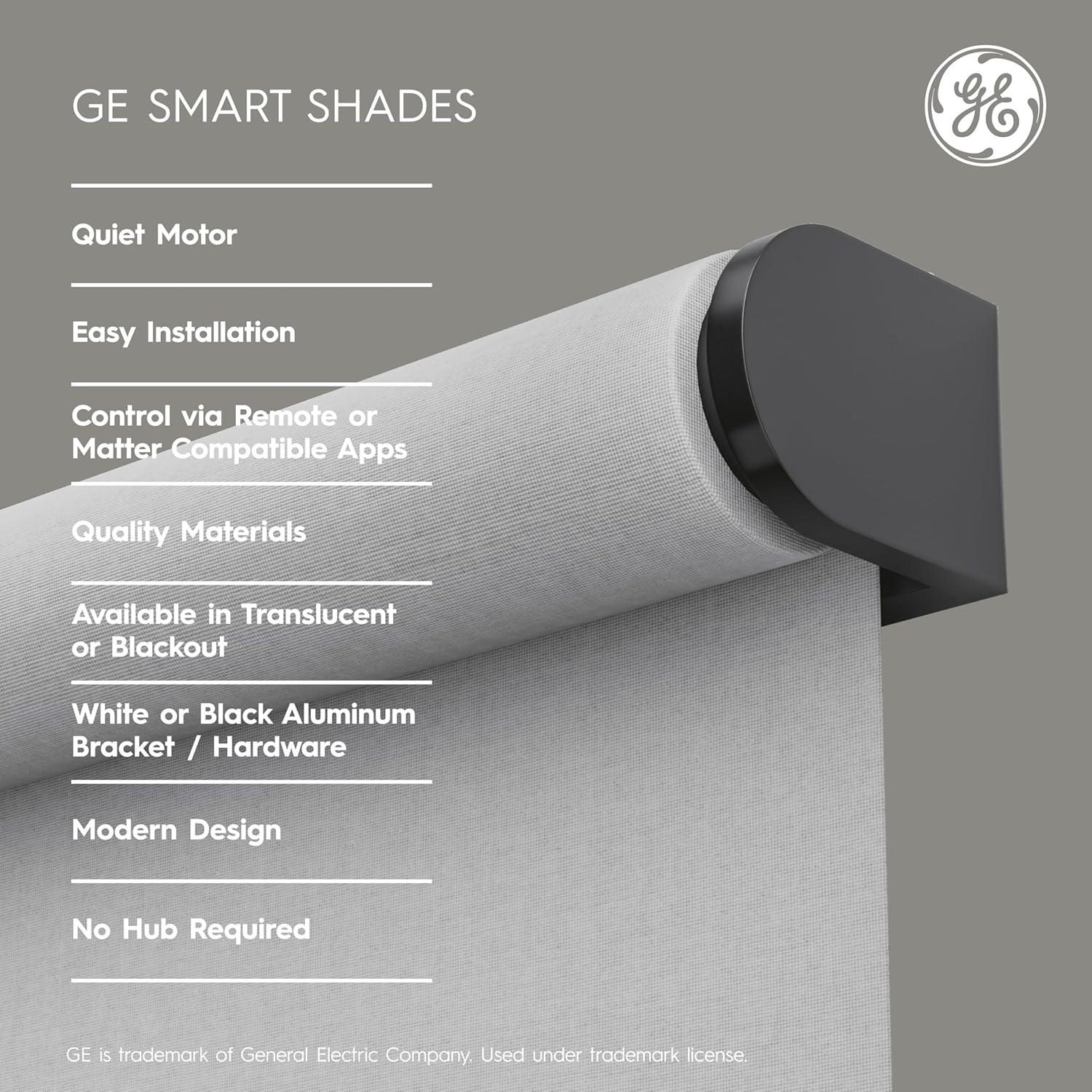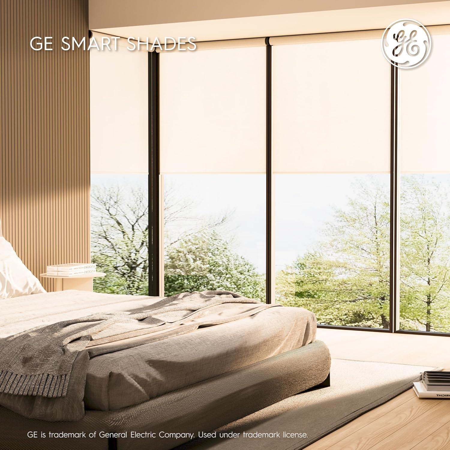 Upgrade your home with GE Smart Shades, the modern motorized window treatment that blends effortless automation with elevated design. Engineered with a patented, easy to install, system and no visible hardware. These shades deliver a clean, tailored look that complements any space. Choose from blackout or light-filtering fabrics in sleek white or gray finishes, all framed in durable aluminum trim that’s built to last. Enjoy quiet, smooth operation and total control with Matter compatibility to easily connect directly to leading smart home devices (sold separately) and apps for hands-free voice control or use the included remote. Set personalized schedules to open and close automatically throughout the day, creating comfort, privacy, and energy efficiency on your terms. With their long-lasting durability and premium craftsmanship, GE Smart Shades bring the perfect blend of innovation and sophistication to your bedroom, living room, or office.